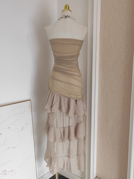 Sexy High Low Strapless Champagne Chiffon Ruffles Vacation Dress Women Dresses SD141
