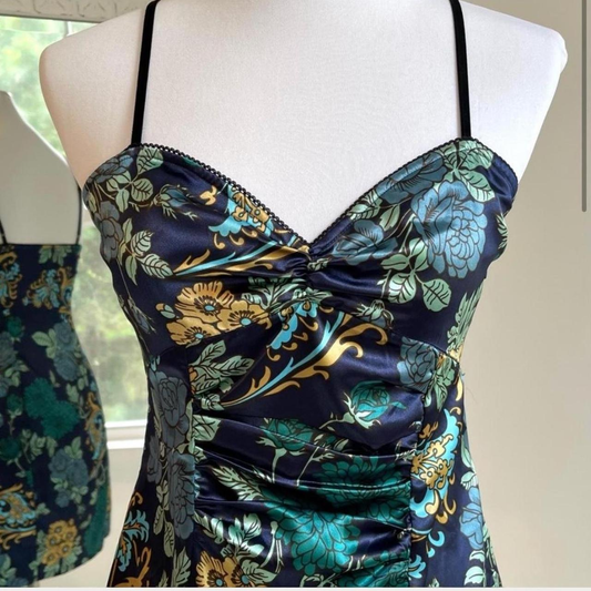 Vintage Navy Blue Straps Satin Print Floral Formal Graduation Homecoming Dress Short Cocktail Dress D150