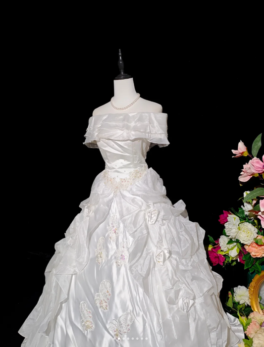 Vintage White Ball Gown Off The Shoulder Satin Pleated Appliques Beaded Birthday Quinceanera Dress D2356