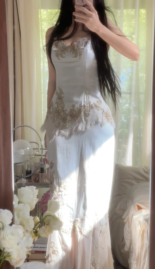 Vintage White Satin Appliques Chiffon Mermaid Long Birthday Prom Dress Party Gown D2303