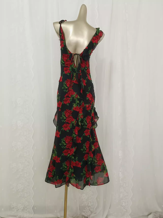 Vintage A line Spaghetti Straps Red Rose Travel Vacation Floral Beach Dress Birthday Outfits SD0017