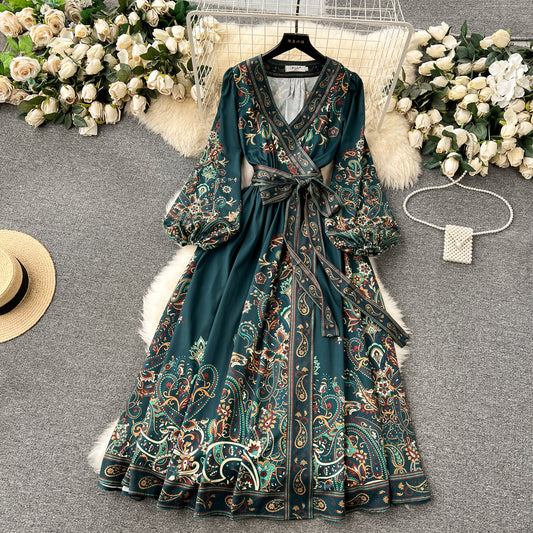 Chic A line Long Sleeves Green Floral Holiday Dresses Autumn Women's Dress SD1280