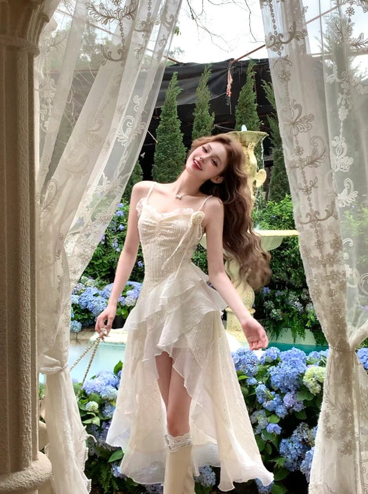 Sexy High Low Spaghetti Straps Ivory Holiday Dresses Night Dress Birthday Outfits SD1221