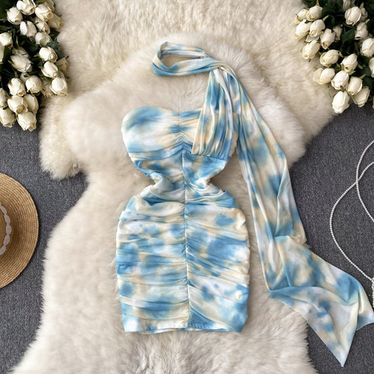 Sexy Sheath Strapless Blue Floral Holiday Dresses Short Length Women's Dress SD1275