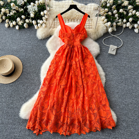 Simple A line Straps Orange Lace Holiday Dresses Midi Length Women's Dress SD1273