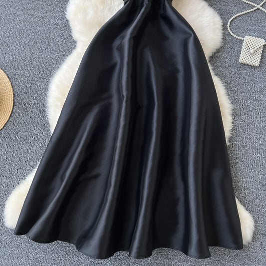 Simple A line Straps Black Satin Holiday Dresses Midi Length Women's Dress SD1272