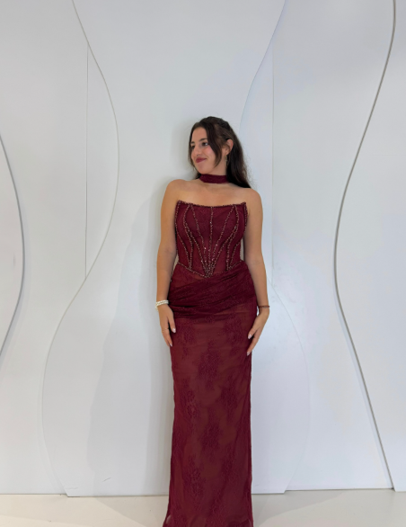 Vintage Burgundy Strapless Lace Beaded Long Wedding Guest Dress Formal Evening Dress Party Gown D1972