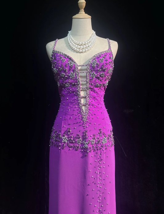 Classy Spaghetti Straps Purple Chiffon Beaded Long Wedding Guest Dress Formal Birthday Prom Dress Party Gown D1937