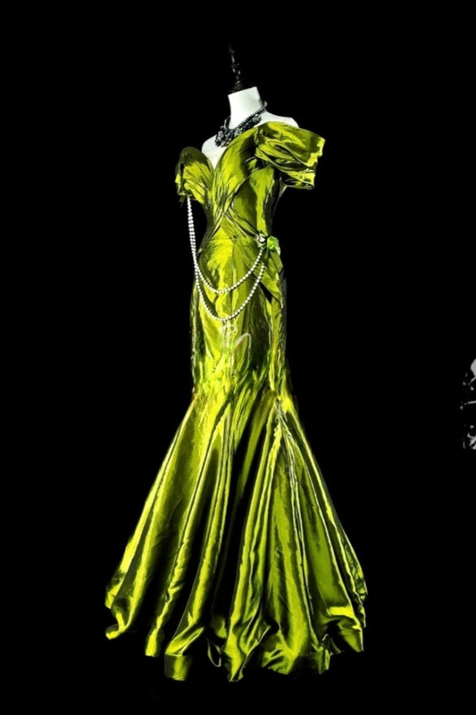 Unique Green Off The Shoulder Satin Pleated Mermaid Evening Dress Long Birthday Party Dress D1947