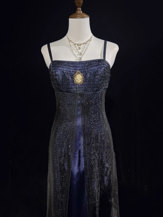 Gorgeous Spaghetti Straps Navy Blue Satin Beaded Long Party Dress Evening Dresses D1845