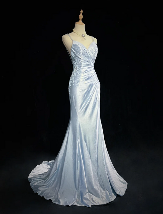 Elegant Spaghetti Straps Blue Satin Appliques Sequin Mermaid Long Wedding Guest Dress Evening Dress D1846