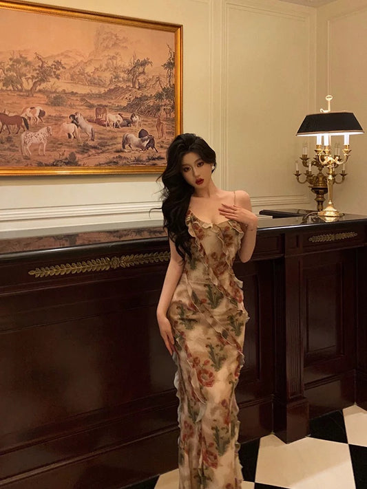 Stunning Mermaid Spaghetti Straps Floral Ruffles Long Prom Dresses Birthday Outfit SD781
