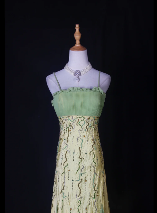 Chic Spaghetti Straps Yellow-green Satin Beaded Mermaid Long Party Dress Birthday Evening Gown With Ruffles D2267