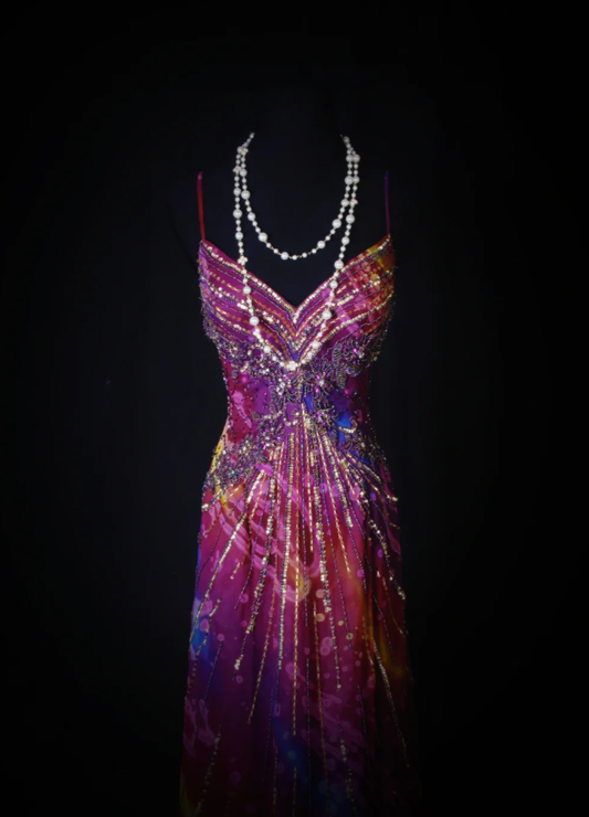 Unique V Neck Purple Spaghetti Straps Chiffon Beaded Mermaid Long Party Dress Evening Gown D2262