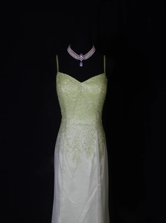 Classy Spaghetti Straps Satin Chiffon Beaded Mermaid Evening Dress Ombre Green Birthday Prom Dress D2261