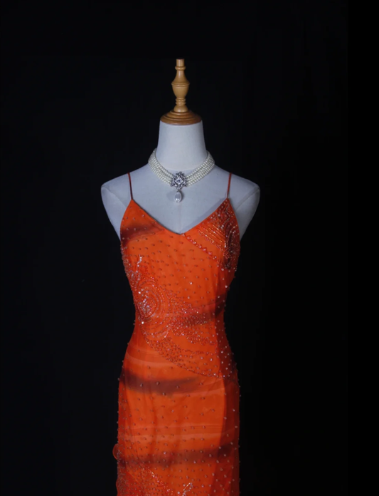 Pretty Orange Spaghetti Straps Chiffon Beaded Ruffle Mermaid Long Prom Dress Evening Gown D2268