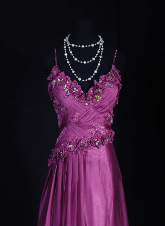 Glamorous Spaghetti Straps Satin Floral Beaded Mermaid Long Birthday Prom Dress Evening Dress D2257