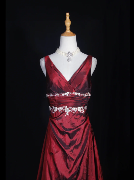 Vintage Burgundy V Neck Satin Appliques Mermaid Long Wedding Guest Dress Formal Evening Gowns D2273
