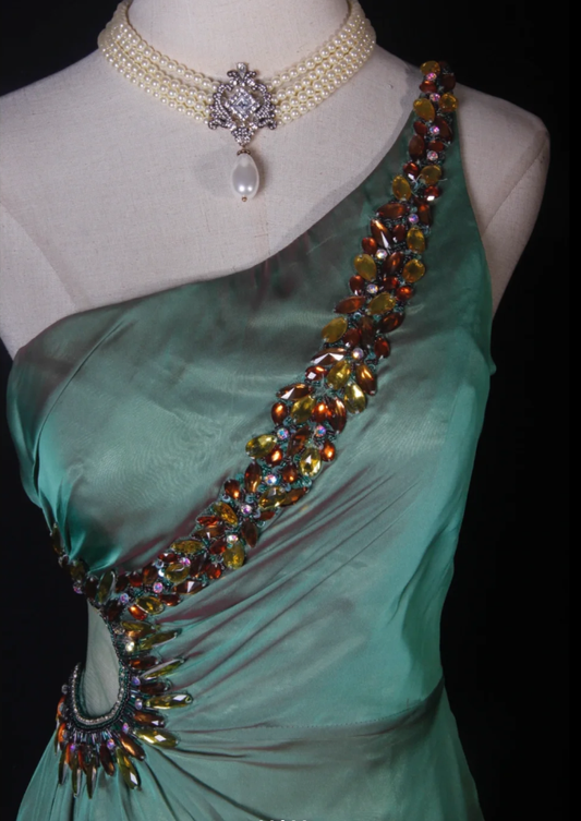 Vintage Green One Shoulder Satin Chiffon Beaded Mermaid Long Evening Dress Birthday Dress D2269