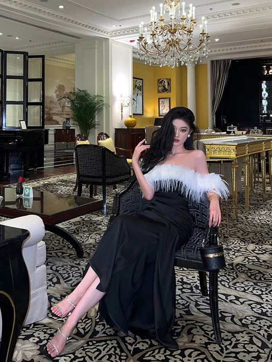 Sexy Sheath Off The Shoulder Short Sleeves Black Slit Satin Prom Dresses Birthday Outfits SD646