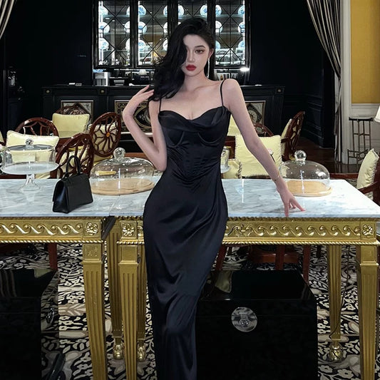 Simple Mermaid Spaghetti Straps Black Ankle Length Prom Dresses Birthday Outfits SD745