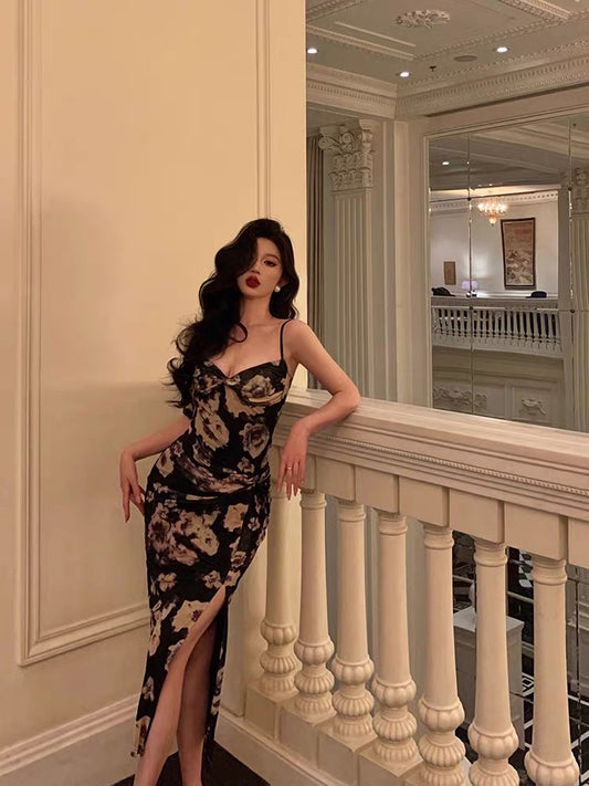 Sexy Sheath Spaghetti Straps Black Floral Slit Prom Dresses Birthday Outfits SD753