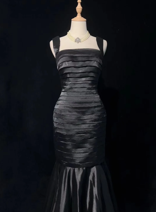 Fashion Black Satin Pleated Mermaid Long Evening Dress Wedding Guest Dress D2061