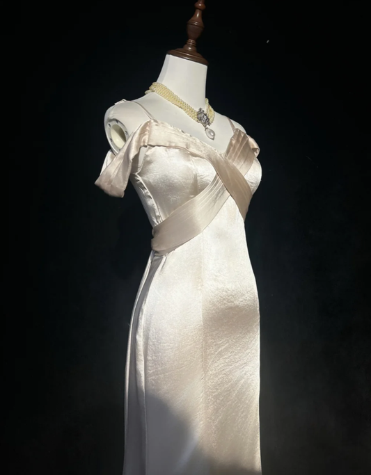 Elegant Light Champagne Off The Shoulder Formal Wedding Guest Dress Long Mermaid Slit Evening Dress Party Dress D2065