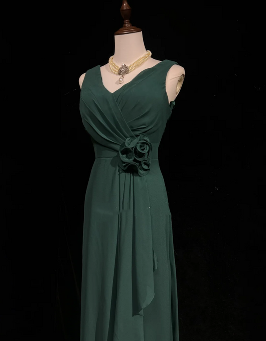 Vintage V Neck Dark Green Chiffon Long Wedding Guest Dress Formal Evening Dress Prom Gowns D2059