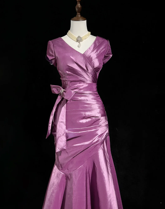 Elegant Purple V Neck Satin Pleated Mermaid Long Evening Dress Birthday Prom Dresses D2067