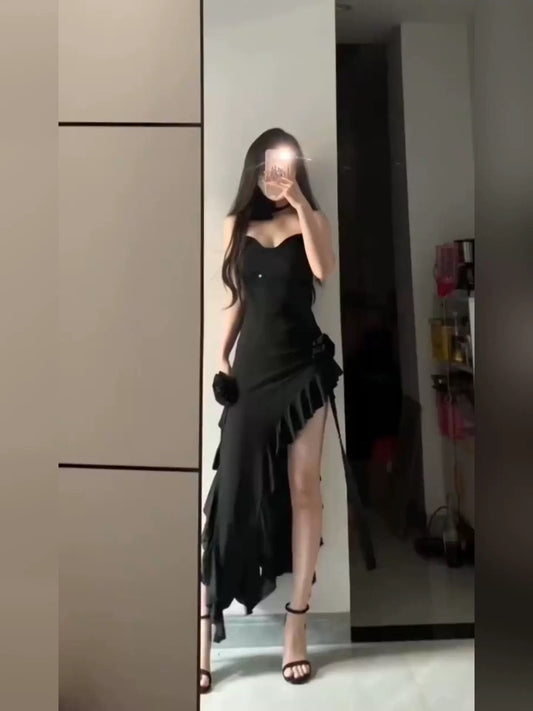 Simple Sheath Spaghetti Straps Black Satin Vacation Beach Dress Long Birthday Dresses SD006
