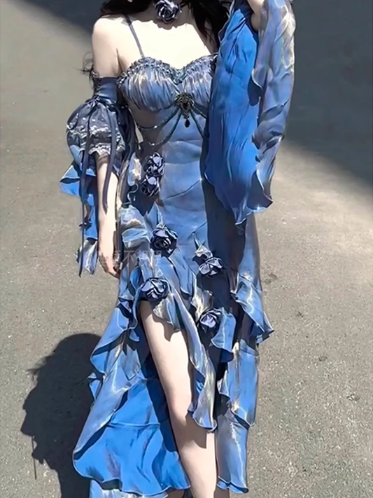 Retro Mermaid Off The Shoulder Floral Blue Long Sleeves Party Dresses Birthday Outfits SD529