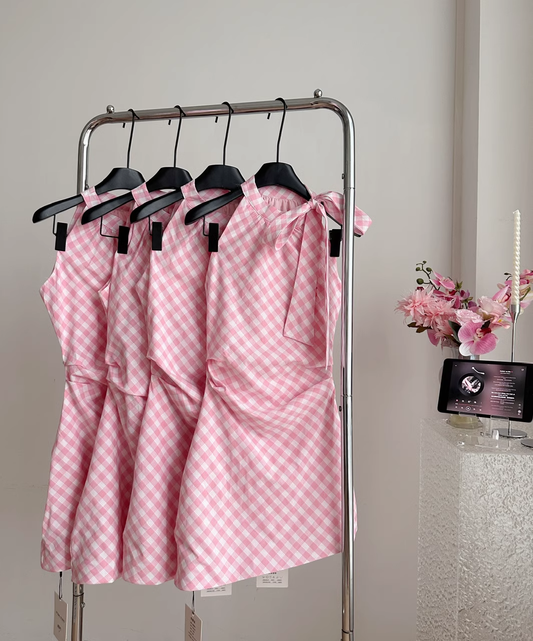 Halter Neck Off Shoulder Pink Plaid Sleeveless Dress Irregular Bow Holiday Dresses SD258