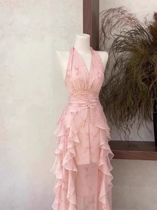 Sexy A Line Halter Ruffled Floral Pink Long Women's Holiday Dresses SD206