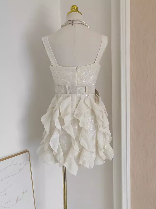 Cute A line Straps White Sequin Travel Vacation Dresses Short Birthday Dress SD165