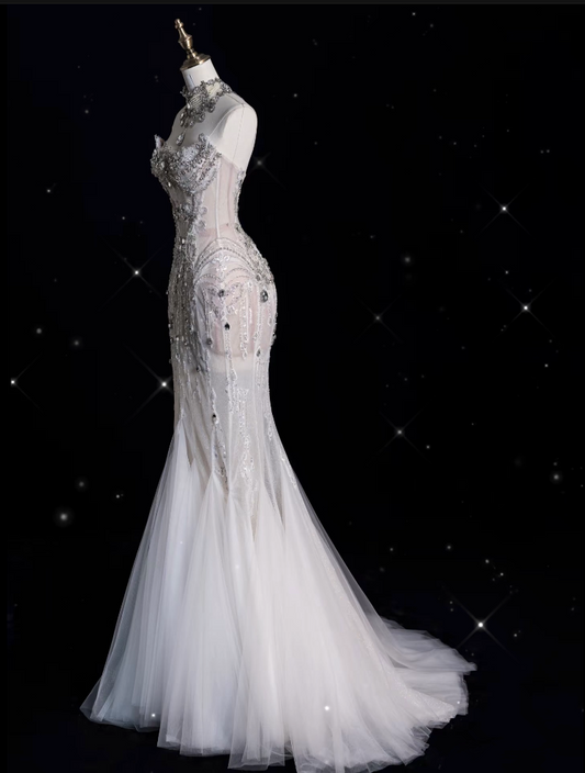 Sexy Mermaid Strapless Tulle With Silver Beads Long Wedding Dresses Brides Dress SD1864