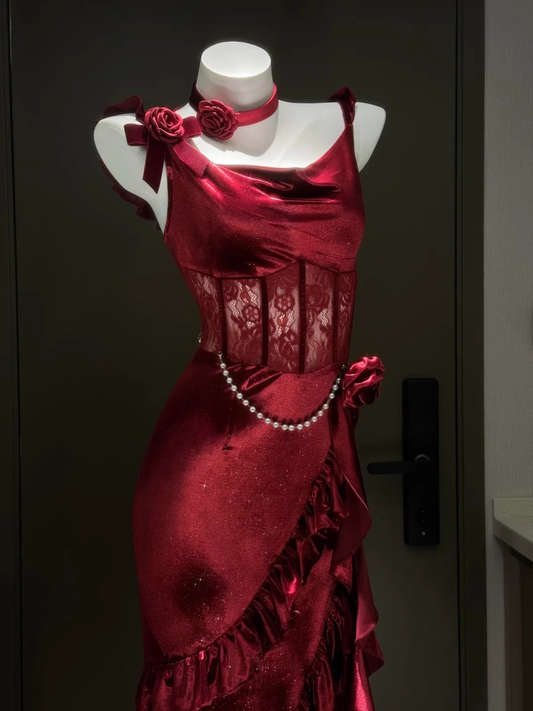 Retro Mermaid Spaghetti Straps Burgundy Lace Prom Dresses Birthday Outfits SD527