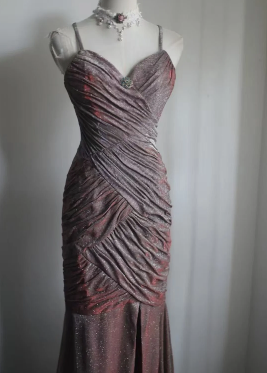 Shiny Spaghetti Straps Purple Satin Sequin Pleated Mermaid Slit Long Evening Dress Birthday Party Gown D2319