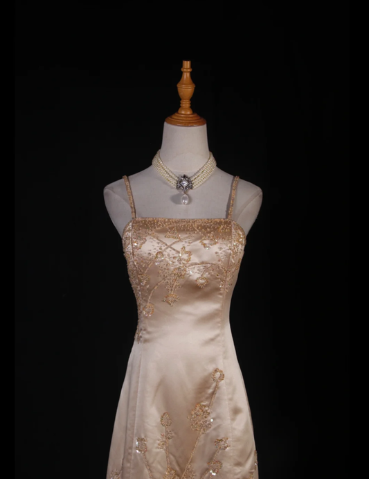 Fashion Spaghetti Straps Yellow Satin Beaded Mermaid Long Party Dress Evening Dress D2249
