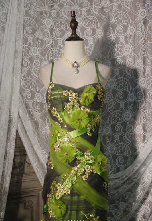 Vintage Green Spaghetti Straps Satin Tulle Appliques Mermaid Prom Dress Long Evening Dress D2250