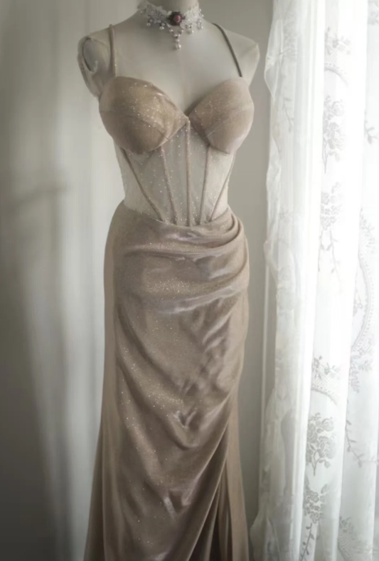 Glitter Spaghetti Straps Satin Beaded Mermaid Slit Evening Dress Long Prom Dress D2320