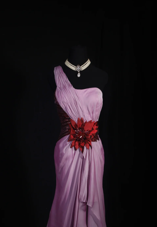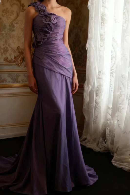 Elegant Purple One Shoulder Satin Floral Mermaid Long Party Dress Formal Wedding Guest Dress D2312