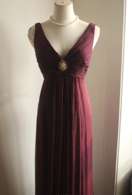 Retro Dark Purple V Neck Chiffon Long Prom Dress Evening Gown D2315