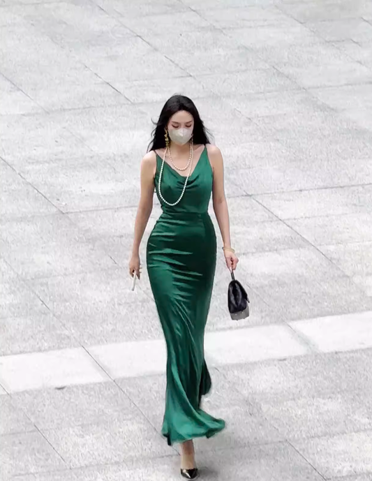 Vintage Mermaid Off The Shoulder Green Vacation Dress Satin Birthday Dresses SD0021