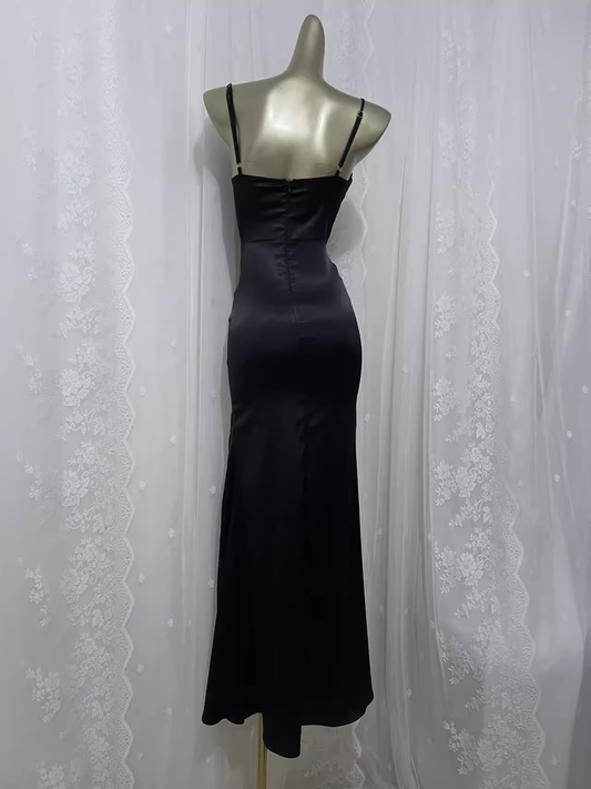 Vintage Sheath Backless Travel Vacation Black Satin Beach Dress Long Dress SD002