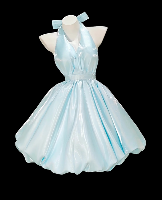 Sweet Halter V Neck Blue Satin A Line Short Homecoming Dress 17th Birthday Outfits D2352