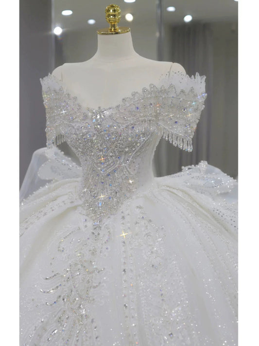 Luxury Ball Gown Off The Shoulder Short Sleeves Sequin White Wedding Dresses Brides Dress SD1955