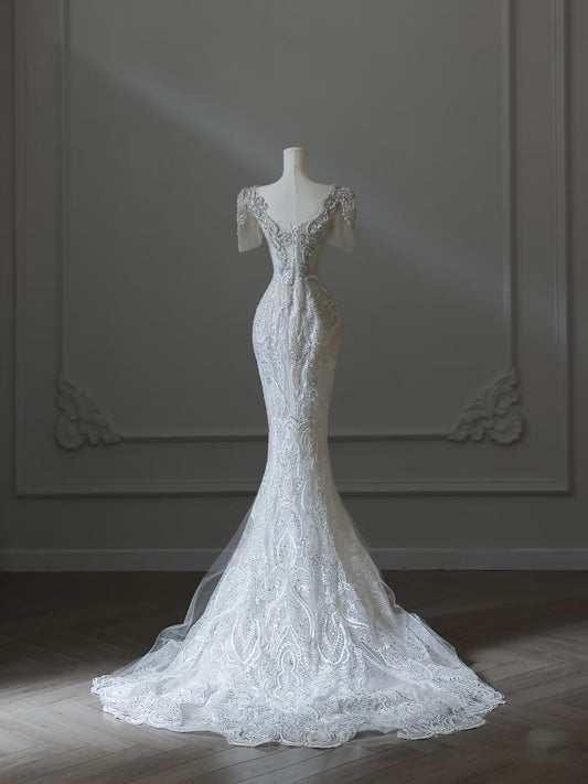 Unique Mermaid Square Neckline Short Sleeves Wedding Dresses White Brides Dress S3859
