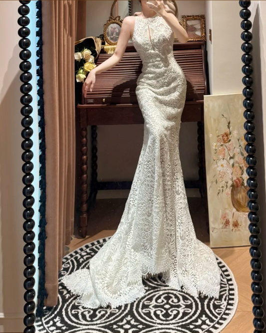 Retro Lace Sleeveless Mermaid Long Wedding Dress White Bridal Dresses D2034