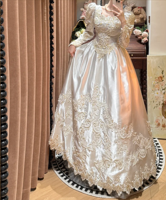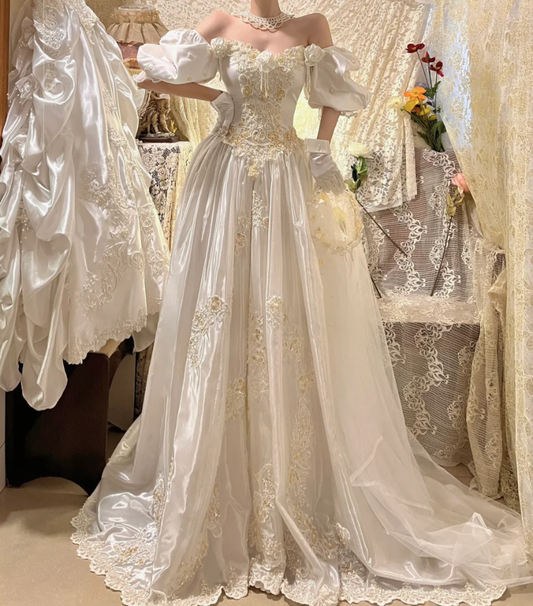 Charming White Off The Shoulder Satin Beaded Appliques Ball Gown Long Wedding Dress Bridal Dress D2035